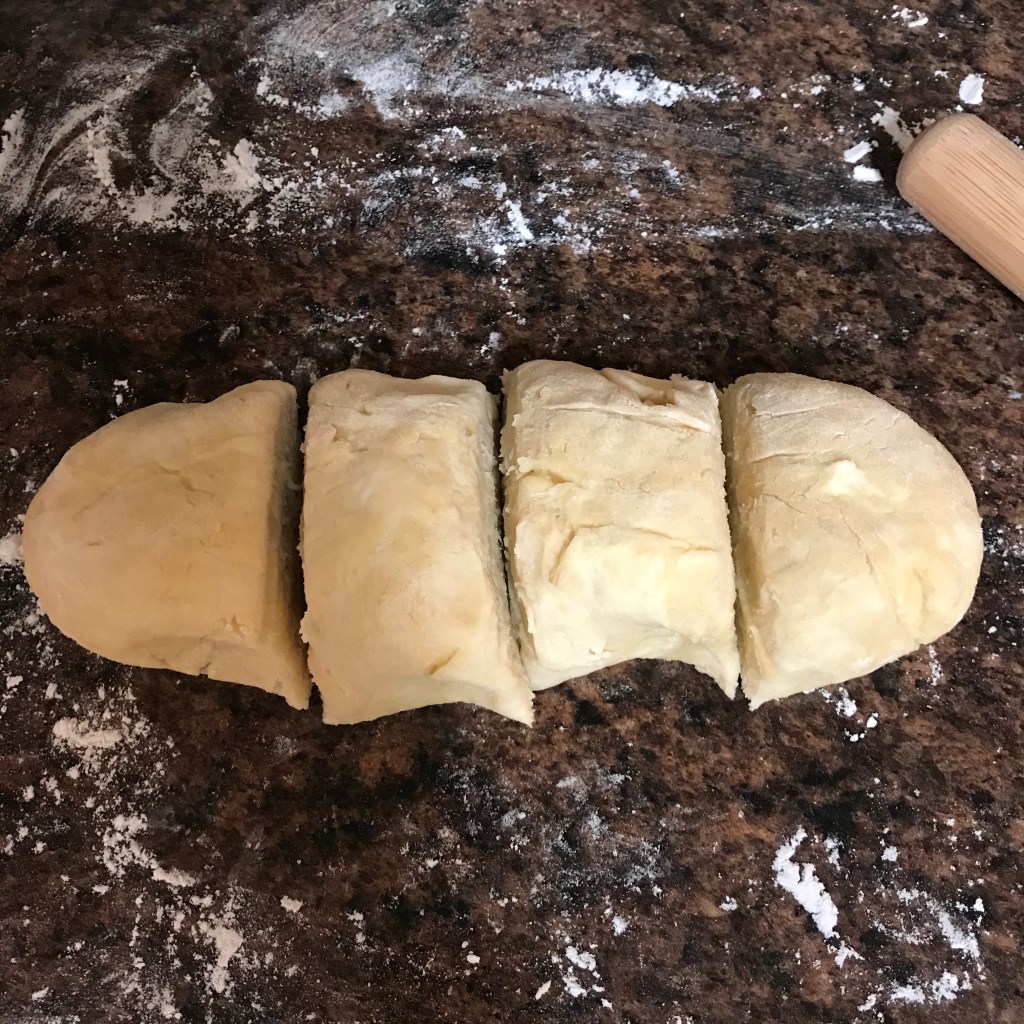 - 將派皮麵團分成四份,擀成圓形 Cut the dough into 4 portions. Roll them into thin round slice