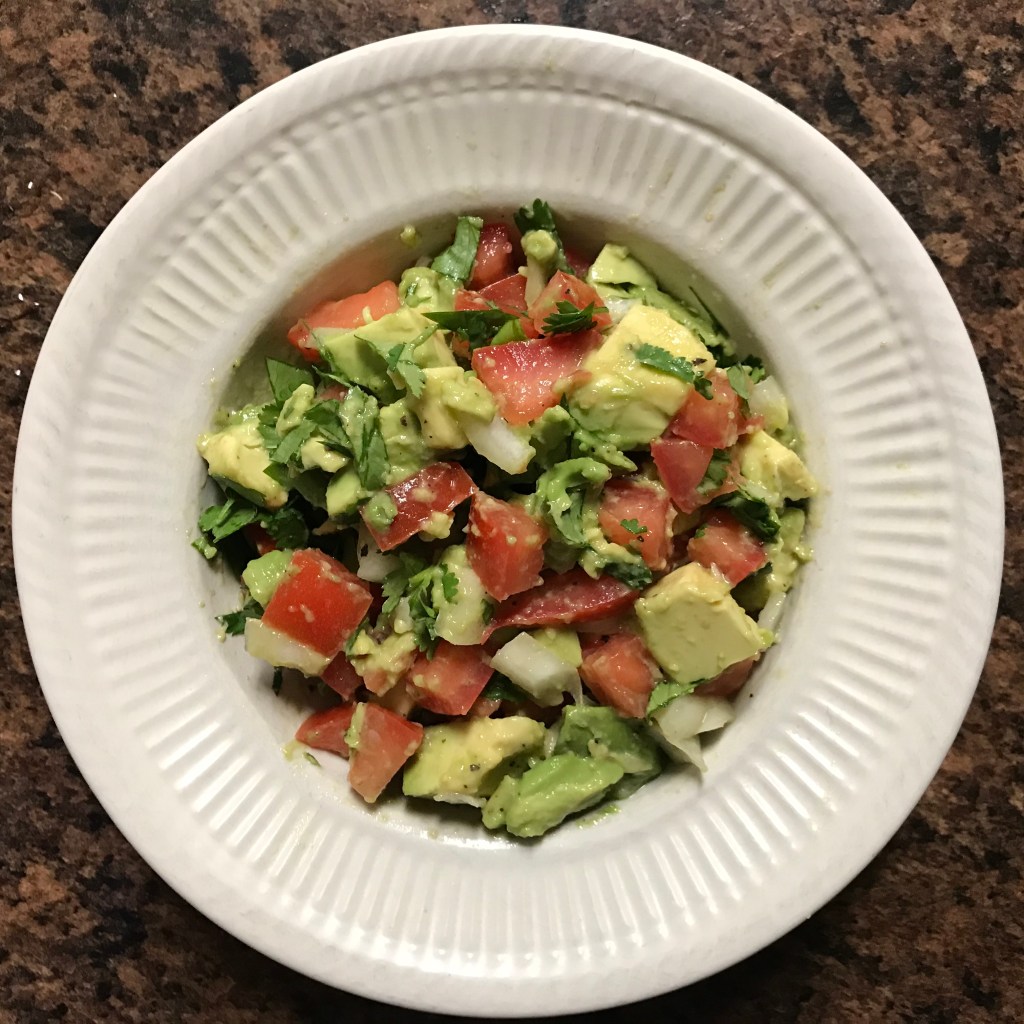 Salsa的做法也是很簡單,兩個人的話基本上一個番茄、一個牛油果、四分一個洋蔥和少許芫荽就可以,番茄、牛油果和洋蔥切粒,芫荽切碎,加入少許檸檬汁(或蘋果醋)、鹽和黑胡椒拌勻就可以。Salsa is very easy to make at home. For two person, you only need one tomato, one avocado, 1/4 onion and some cilantro. Cut tomato, avocado and onion into dices and chop cilantro. Mix them well with a little of lemon juice (or apple cider vinegar) and season with salt and black pepper.