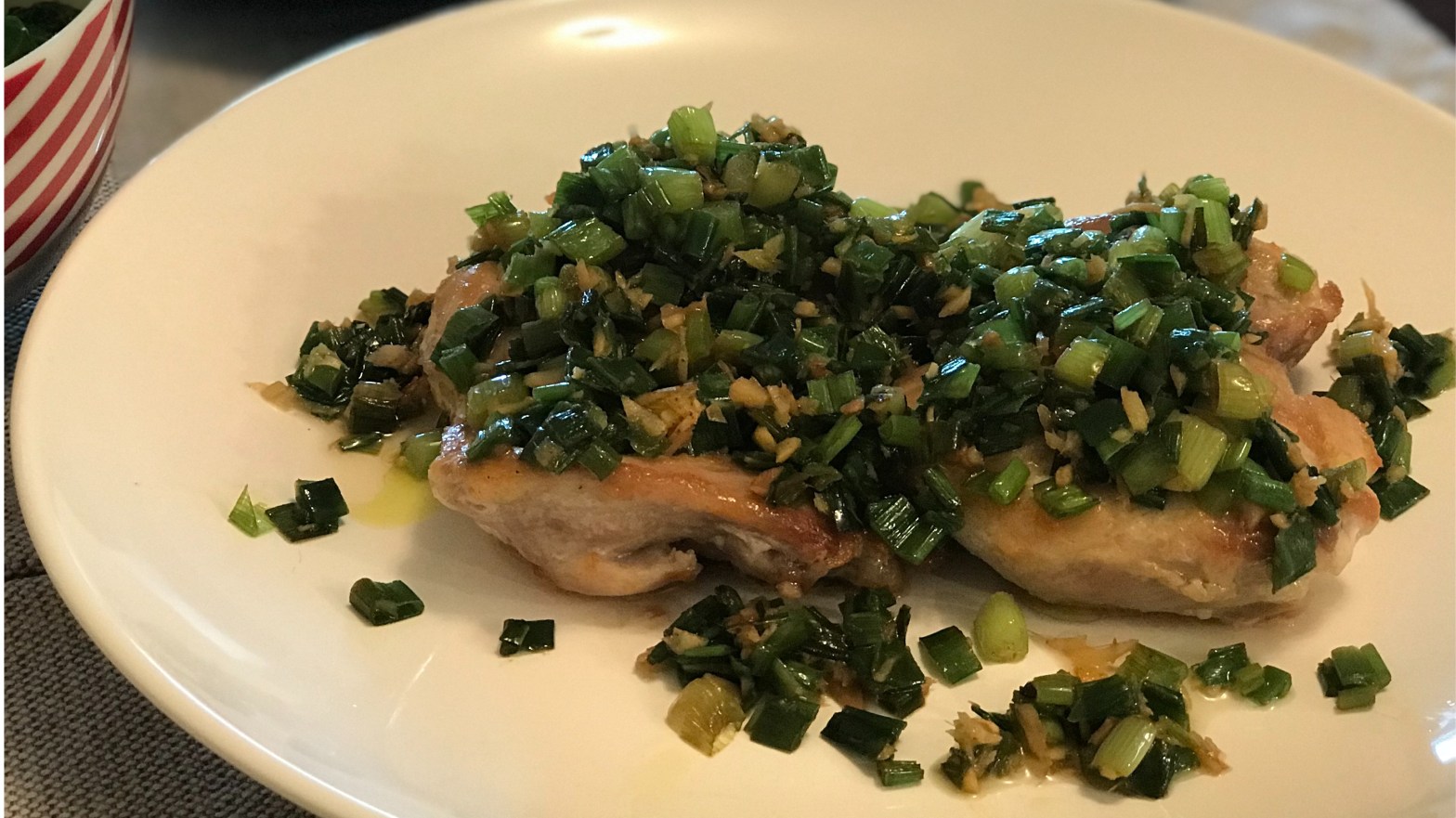 這個食譜的靈感來自於吃香港燒味中我最愛的薑蔥蓉和蔥油雞,用雞排是為了方便不愛吃帶骨頭的雞肉的西人,有點中菜西吃的感覺。