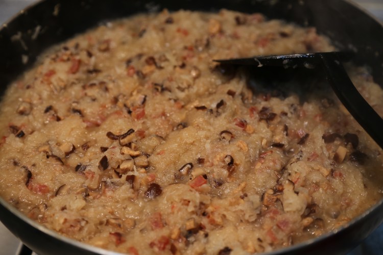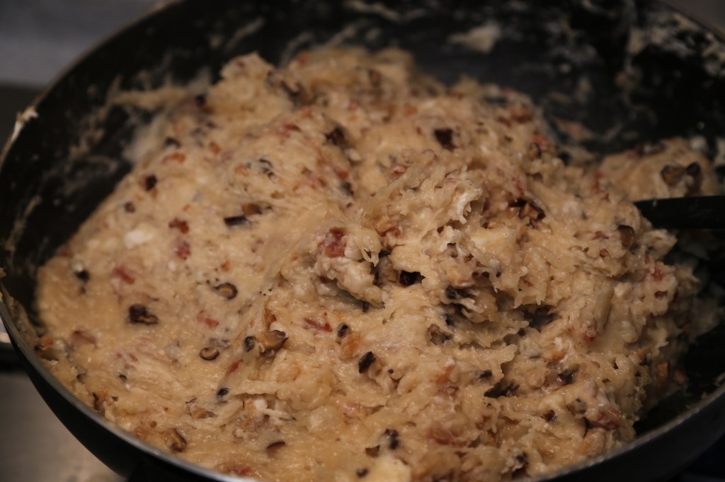 5)把蘿蔔絲連刨蘿蔔的水下鍋煮,加泡過冬菇的水,一定要讓蘿蔔煮一會兒,這樣蘿蔔的甜度才會出來,待蘿蔔煮開,把料加回去拌勻,加鹽、胡椒粉和雞粉調味,再煮開了之後,把火關到最少,再把粉漿一點點的加進去,一邊加,一邊拌勻,要煮成濃稠的漿糊狀才行,這個步驟不能急,要慢,越濃稠越難拌,但不能停,為什麼?誰叫你想吃自家製蘿蔔糕?而且做人不能半途而廢!In the same pan, add the shredded radish including the radish juice. Add the soaking water of mushroom. Cook the radish until it’s tender. Add back the cooked sausage, mushroom and shrimp. Season with salt, pepper and some chicken bouillon powder. Turn the heat to the lowest. Add the flour paste gradually and keep stirring it unit the radish cake paste is formed.