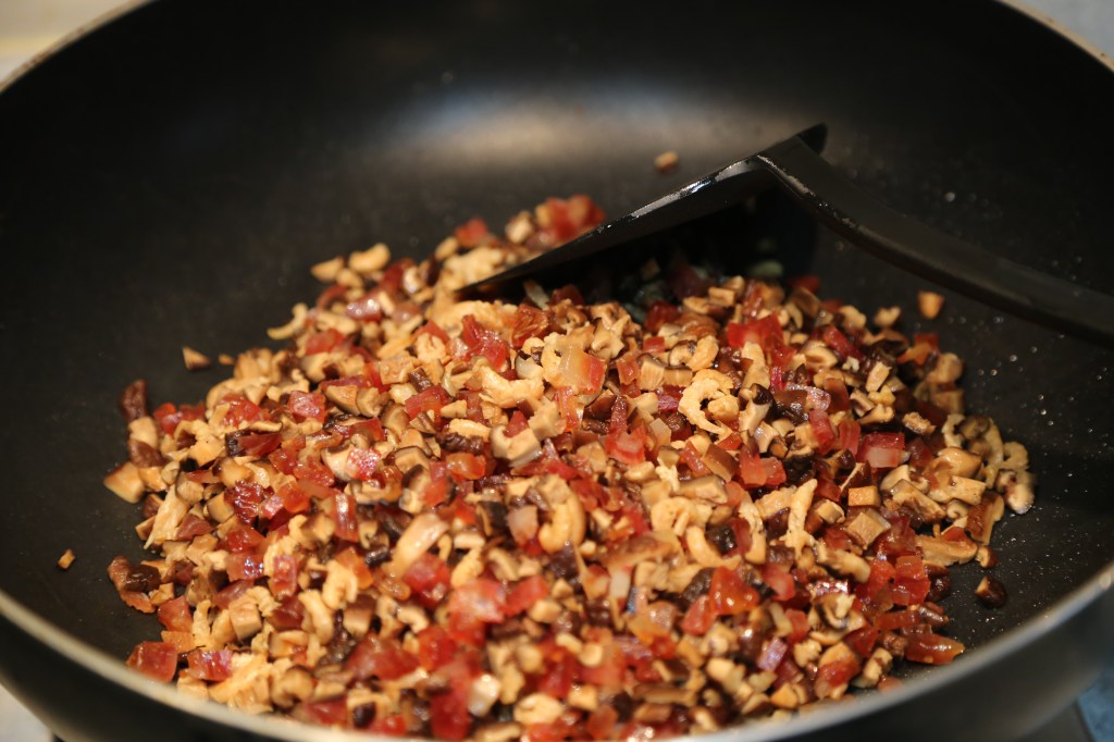 4)先把鍋燒熱,加少許油,把臘腸、冬菇和蝦米和炒香,把炒香的料盛出來。Heat up the pan. Add a little oil. Add the Chinese sausage, mushroom and shrimp and stir fry for about 3-4 mins until the flavour is coming out. Set aside.