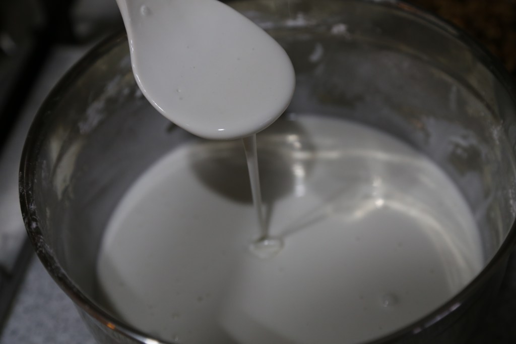 3)把粘米粉和粟粉拌勻,加適量的水拌開,能拌開就可以,水不用太多,這個配方的話,我大概用350-400毫升的水。Mix the rice flour and cornstarch and add water. Just enough to mix them well. In this recipe, I use about 350-400ml water.