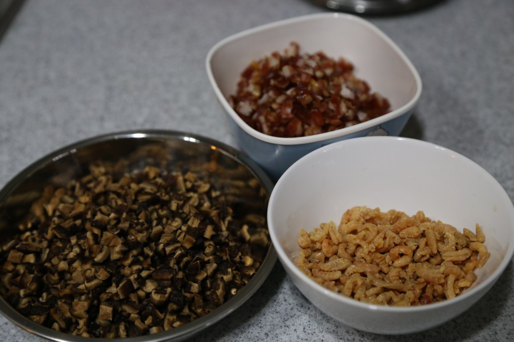 1)用熱水將冬菇和蝦米泡軟,大概需要30分鐘,記得要先將冬菇和蝦米先洗乾淨再泡,這樣泡過冬菇和蝦米的水可以留著在煮蘿蔔的時候用,提升鮮甜味。臘腸、冬菇和蝦米切成小粒。Soak the dried mushroom and shrimp in hot water for at least 30 mins. Wash them before soaking and thus you can use the soaking water later. Cut the sausage, mushroom and shrimp into small dices.